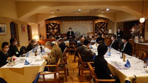 2021年最後の支部行事は、12月17日(金)19時から、夕方からの横殴りの雨が降りしきる中、海木実先輩(1971年商卒)がオーナーを務められる富山県内初のイタリアレストラン『フィオーレ ディ ファリーナ』において、同志社大学 学長室校友課の矢田直人課長(1995年経済卒)も京都からご来県され開催されました。